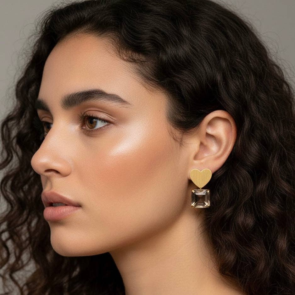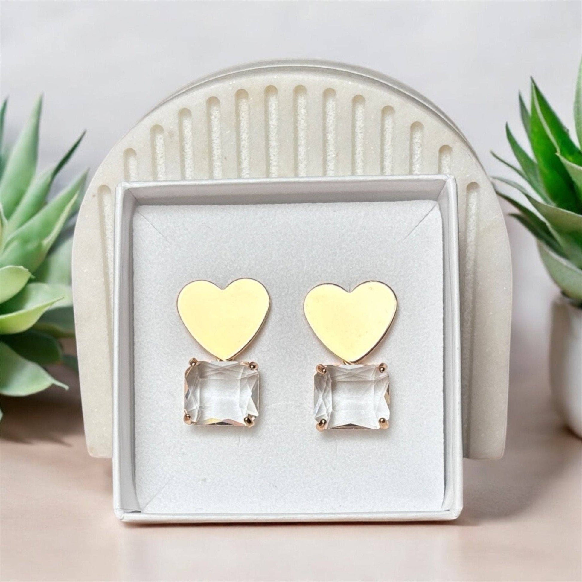 These stud earrings feature a romantic and modern design, with a large heart in 18k gold-plated steel that shines delicately. The glass pendant adds a refined and luminous touch, creating an elegant play of light with every movement.